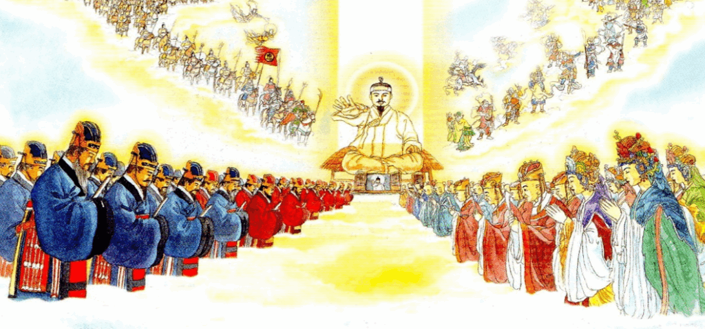 The final and most direct proclamation of Sangjenim’s arrival came through Donghak (“Eastern Learning”) in Korea. Its founder, Choe Su-un, experienced a profound revelation in 1860, where a divine voice asked him, “Do you not know Sangje?”. The core teaching he received was Sichonju (侍天主), which means, “Bear the Lord of Heaven, for he is incarnating as a human, and through this a new world of creation is established.”. It was a direct announcement that the age of the Son was ending and the age of the Father was beginning, with the arrival of Sangjenim and the emergence of the Mugeuk-daedo (Way of the Supreme Ultimate).
